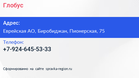 Глобус по адресу Еврейская АО, Биробиджан, Пионерская, 75 в дальнейшем Организация, размещена в следующих категориях:
