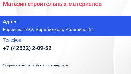 Магазин строительных материалов по адресу Еврейская АО, Биробиджан, Калинина, 51 в дальнейшем Организация, размещена в следующих категориях: