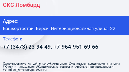 СКС Ломбард по адресу Башкортостан, Бирск, Интернациональная улица, 22 в дальнейшем Организация, размещена в следующих категориях: