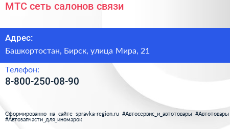 МТС, сеть салонов связи по адресу Башкортостан, Бирск, улица Мира, 21 в дальнейшем Организация, размещена в следующих категориях: