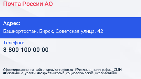 Почта России, АО по адресу Башкортостан, Бирск, Советская улица, 42 в дальнейшем Организация, размещена в следующих категориях: