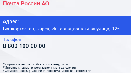 Почта России, АО по адресу Башкортостан, Бирск, Интернациональная улица, 125 в дальнейшем Организация, размещена в следующих категориях: