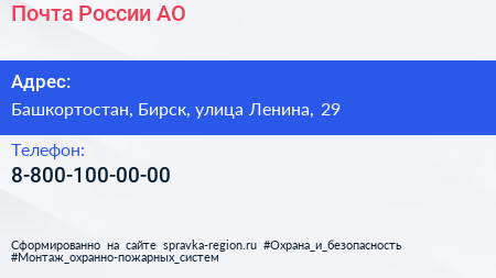 Почта России, АО по адресу Башкортостан, Бирск, улица Ленина, 29 в дальнейшем Организация, размещена в следующих категориях: