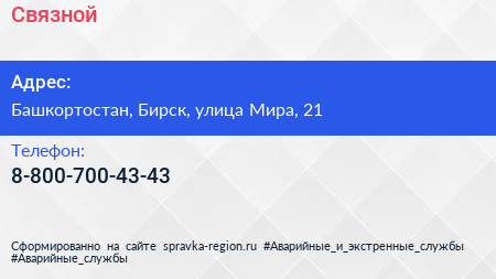 Связной по адресу Башкортостан, Бирск, улица Мира, 21 в дальнейшем Организация, размещена в следующих категориях: