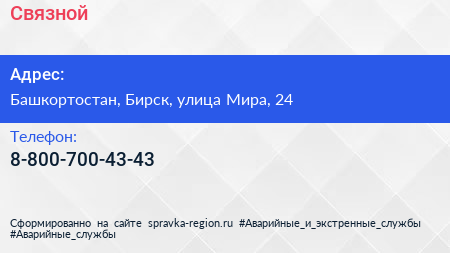 Связной по адресу Башкортостан, Бирск, улица Мира, 24 в дальнейшем Организация, размещена в следующих категориях: