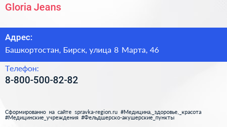 Gloria Jeans по адресу Башкортостан, Бирск, улица 8 Марта, 46 в дальнейшем Организация, размещена в следующих категориях: