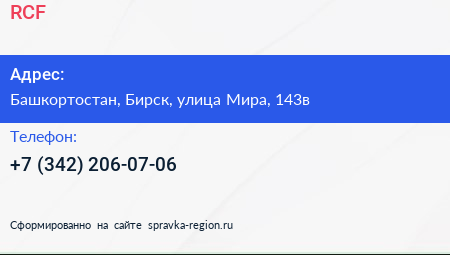 RCF по адресу Башкортостан, Бирск, улица Мира, 143в в дальнейшем Организация, размещена в следующих категориях: