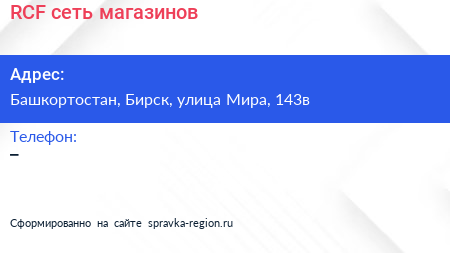 RCF, сеть магазинов по адресу Башкортостан, Бирск, улица Мира, 143в в дальнейшем Организация, размещена в следующих категориях: