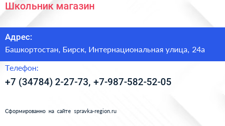 Школьник, магазин по адресу Башкортостан, Бирск, Интернациональная улица, 24а в дальнейшем Организация, размещена в следующих категориях: