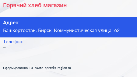 Горячий хлеб, магазин по адресу Башкортостан, Бирск, Коммунистическая улица, 62 в дальнейшем Организация, размещена в следующих категориях: