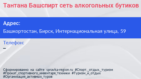 Тантана-Башспирт, сеть алкогольных бутиков по адресу Башкортостан, Бирск, Интернациональная улица, 59 в дальнейшем Организация, размещена в следующих категориях: