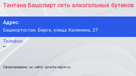 Тантана-Башспирт, сеть алкогольных бутиков по адресу Башкортостан, Бирск, улица Калинина, 27 в дальнейшем Организация, размещена в следующих категориях: