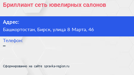 Бриллиант, сеть ювелирных салонов по адресу Башкортостан, Бирск, улица 8 Марта, 46 в дальнейшем Организация, размещена в следующих категориях: