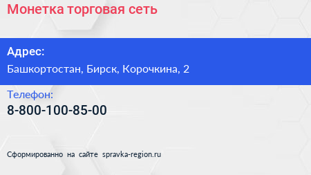 Монетка, торговая сеть по адресу Башкортостан, Бирск, Корочкина, 2 в дальнейшем Организация, размещена в следующих категориях: