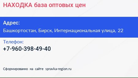 НАХОДКА, база оптовых цен по адресу Башкортостан, Бирск, Интернациональная улица, 22 в дальнейшем Организация, размещена в следующих категориях: