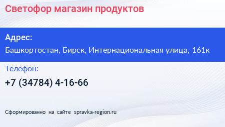 Светофор, магазин продуктов по адресу Башкортостан, Бирск, Интернациональная улица, 161к в дальнейшем Организация, размещена в следующих категориях: