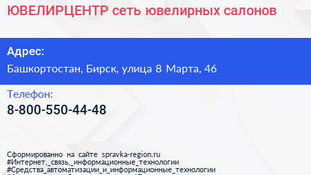ЮВЕЛИРЦЕНТР, сеть ювелирных салонов по адресу Башкортостан, Бирск, улица 8 Марта, 46 в дальнейшем Организация, размещена в следующих категориях: