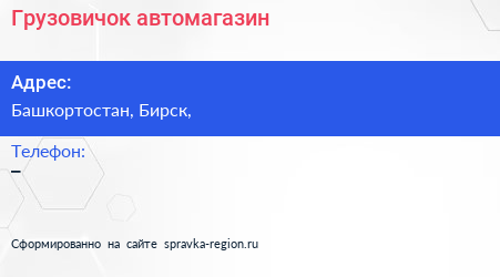 Грузовичок, автомагазин по адресу Башкортостан, Бирск, в дальнейшем Организация, размещена в следующих категориях: