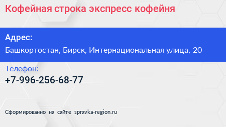 Кофейная строка, экспресс-кофейня по адресу Башкортостан, Бирск, Интернациональная улица, 20 в дальнейшем Организация, размещена в следующих категориях: