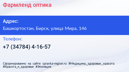Фармленд, оптика по адресу Башкортостан, Бирск, улица Мира, 146 в дальнейшем Организация, размещена в следующих категориях: