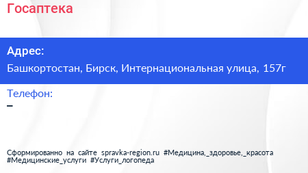 Госаптека по адресу Башкортостан, Бирск, Интернациональная улица, 157г в дальнейшем Организация, размещена в следующих категориях: