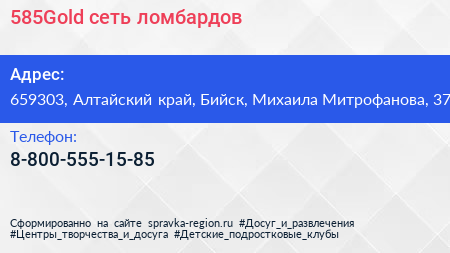 585Gold, сеть ломбардов по адресу 659303, Алтайский край, Бийск, Михаила Митрофанова, 37 в дальнейшем Организация, размещена в следующих категориях: