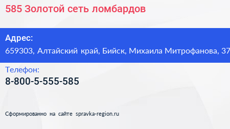 585*Золотой, сеть ломбардов по адресу 659303, Алтайский край, Бийск, Михаила Митрофанова, 37 в дальнейшем Организация, размещена в следующих категориях: