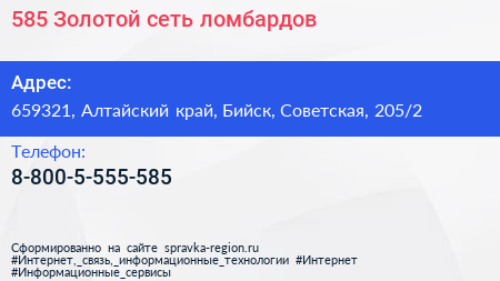 585*Золотой, сеть ломбардов по адресу 659321, Алтайский край, Бийск, Советская, 205/2 в дальнейшем Организация, размещена в следующих категориях: