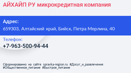 АЙХАЙП.РУ, микрокредитная компания по адресу 659303, Алтайский край, Бийск, Петра Мерлина, 40 в дальнейшем Организация, размещена в следующих категориях: