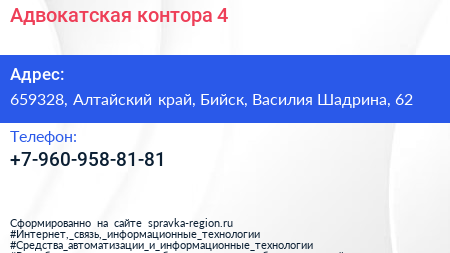 Адвокатская контора №4 по адресу 659328, Алтайский край, Бийск, Василия Шадрина, 62 в дальнейшем Организация, размещена в следующих категориях: