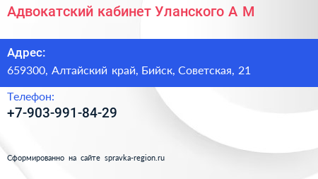 Адвокатский кабинет Уланского А.М. по адресу 659300, Алтайский край, Бийск, Советская, 21 в дальнейшем Организация, размещена в следующих категориях: