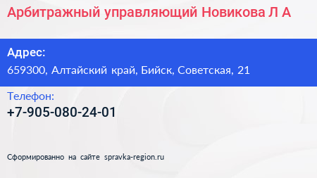 Арбитражный управляющий Новикова Л.А. по адресу 659300, Алтайский край, Бийск, Советская, 21 в дальнейшем Организация, размещена в следующих категориях: