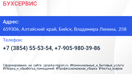 БУХСЕРВИС по адресу 659306, Алтайский край, Бийск, Владимира Ленина, 258 в дальнейшем Организация, размещена в следующих категориях:
