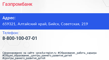 Газпромбанк по адресу 659321, Алтайский край, Бийск, Советская, 219 в дальнейшем Организация, размещена в следующих категориях:
