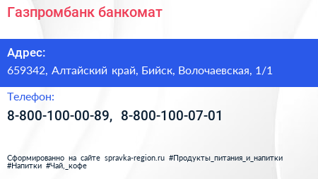 Газпромбанк, банкомат по адресу 659342, Алтайский край, Бийск, Волочаевская, 1/1 в дальнейшем Организация, размещена в следующих категориях: