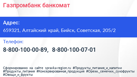 Газпромбанк, банкомат по адресу 659321, Алтайский край, Бийск, Советская, 205/2 в дальнейшем Организация, размещена в следующих категориях: