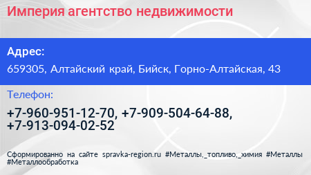 Империя, агентство недвижимости по адресу 659305, Алтайский край, Бийск, Горно-Алтайская, 43 в дальнейшем Организация, размещена в следующих категориях: