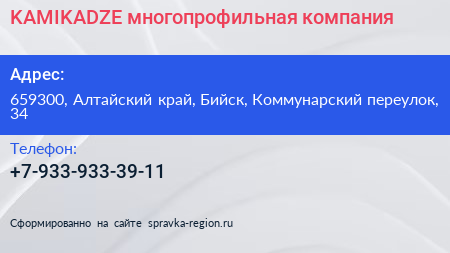 KAMIKADZE, многопрофильная компания по адресу 659300, Алтайский край, Бийск, Коммунарский переулок, 34 в дальнейшем Организация, размещена в следующих категориях: