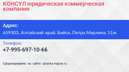 КОНСУЛ, юридическая коммерческая компания по адресу 659303, Алтайский край, Бийск, Петра Мерлина, 51ж в дальнейшем Организация, размещена в следующих категориях: