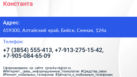 Константа по адресу 659300, Алтайский край, Бийск, Сенная, 124а в дальнейшем Организация, размещена в следующих категориях: