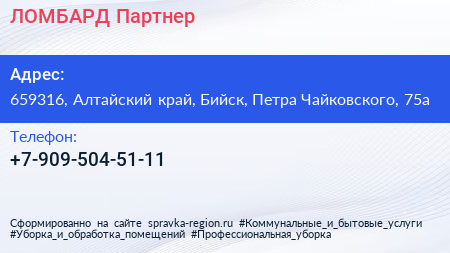 ЛОМБАРД Партнер по адресу 659316, Алтайский край, Бийск, Петра Чайковского, 75а в дальнейшем Организация, размещена в следующих категориях:
