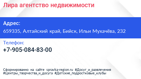 Лира, агентство недвижимости по адресу 659335, Алтайский край, Бийск, Ильи Мухачёва, 232 в дальнейшем Организация, размещена в следующих категориях: