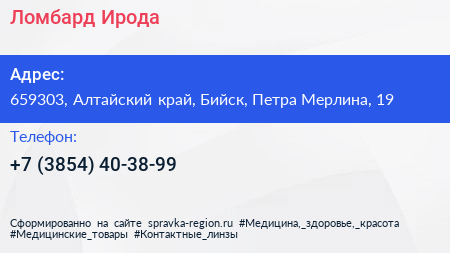 Ломбард Ирода по адресу 659303, Алтайский край, Бийск, Петра Мерлина, 19 в дальнейшем Организация, размещена в следующих категориях: