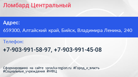 Ломбард Центральный по адресу 659300, Алтайский край, Бийск, Владимира Ленина, 240 в дальнейшем Организация, размещена в следующих категориях: