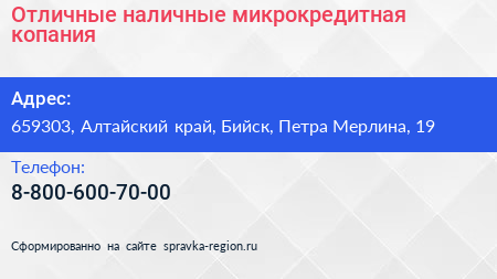Отличные наличные, микрокредитная копания по адресу 659303, Алтайский край, Бийск, Петра Мерлина, 19 в дальнейшем Организация, размещена в следующих категориях: