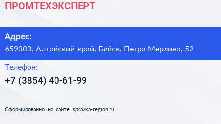 ПРОМТЕХЭКСПЕРТ по адресу 659303, Алтайский край, Бийск, Петра Мерлина, 52 в дальнейшем Организация, размещена в следующих категориях: