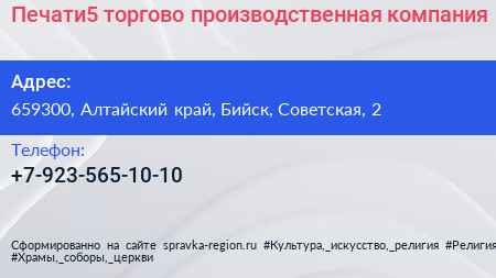 Печати5, торгово-производственная компания по адресу 659300, Алтайский край, Бийск, Советская, 2 в дальнейшем Организация, размещена в следующих категориях: