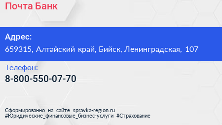Почта Банк по адресу 659315, Алтайский край, Бийск, Ленинградская, 107 в дальнейшем Организация, размещена в следующих категориях: