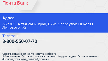 Почта Банк по адресу 659305, Алтайский край, Бийск, переулок Николая Липового, 72 в дальнейшем Организация, размещена в следующих категориях: