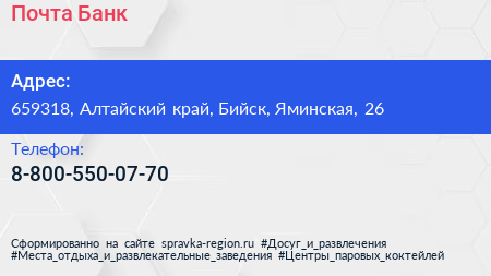 Почта Банк по адресу 659318, Алтайский край, Бийск, Яминская, 26 в дальнейшем Организация, размещена в следующих категориях: